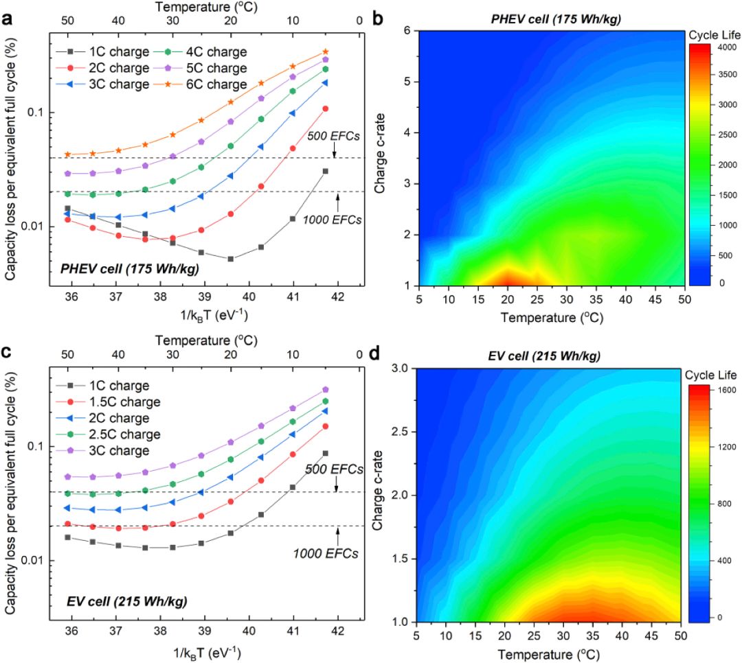 图8 快速充电,能量密度和循环寿命对最佳温度的影响。(a)PHEV电池和(c)EV电池在不同充电倍率下的衰减速率与温度的关系。充电倍率和温度对(b)PHEV电池和(d)EV电池的循环寿命的影响。