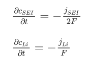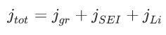 数值模拟研究主要集中在石墨负极,考虑石墨负极的温度依存的老化容量损失行为。电池老化模型同时考虑了SEI增长和析锂反应, 此外还考虑了由于SEI连续生长导致负极极片孔隙率降低,锂离子传输受到影响,这又可能会引起析锂,从而在长时间循环中容量衰减从线性到转变非线性。在负极极片中,电流密度可以分为三个部分:石墨/电解液界面可逆电极反应jgr,SEI膜生成反应jSEI,析锂反应jLi,后两者是不可逆的。因此,总的电流密度jtot可用下式表示: