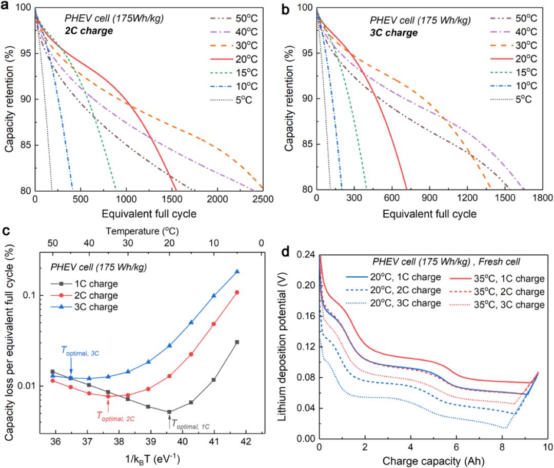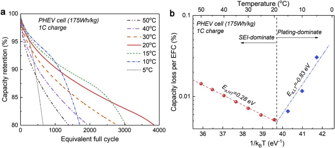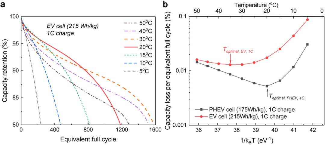 图6 最佳温度随能量密度的增加而增加。 (a)在不同温度下用1C充电时EV电池的容量保持曲线。(b)在1C充电时EV电池与PHEV电池的老化速率比较。EV电池具有PHEV电池的2倍面积负载密度,以及较低的电极孔隙率和较小的N/P比。