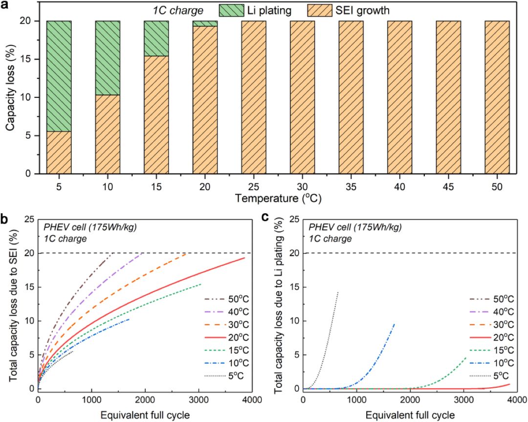 图2 析锂与SEI生长之间的竞争。(a)循环寿命结束(20%总容量损失),SEI生长和析锂引起的容量损失的分解。循环过程中,(b)SEI生长和(c)析锂引起的容量损失的演变。 PHEV电池,在不同温度下1C充电。