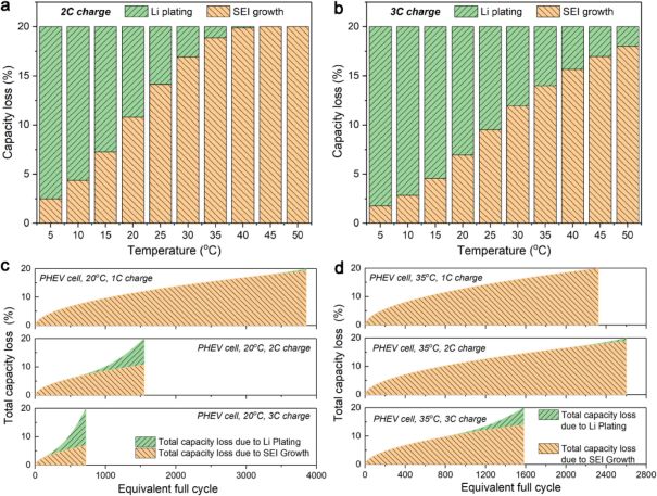 图5 析锂引起的老化率随着充电倍率的增加而增加。循环结束时,不同温度下(a)2C充电和(b)3C充电的PHEV电池SEI生长和析锂容量损失的分解。在(c)20℃和(d)35℃下不同的充电倍率时SEI生长和析锂引起的容量损失的演变。