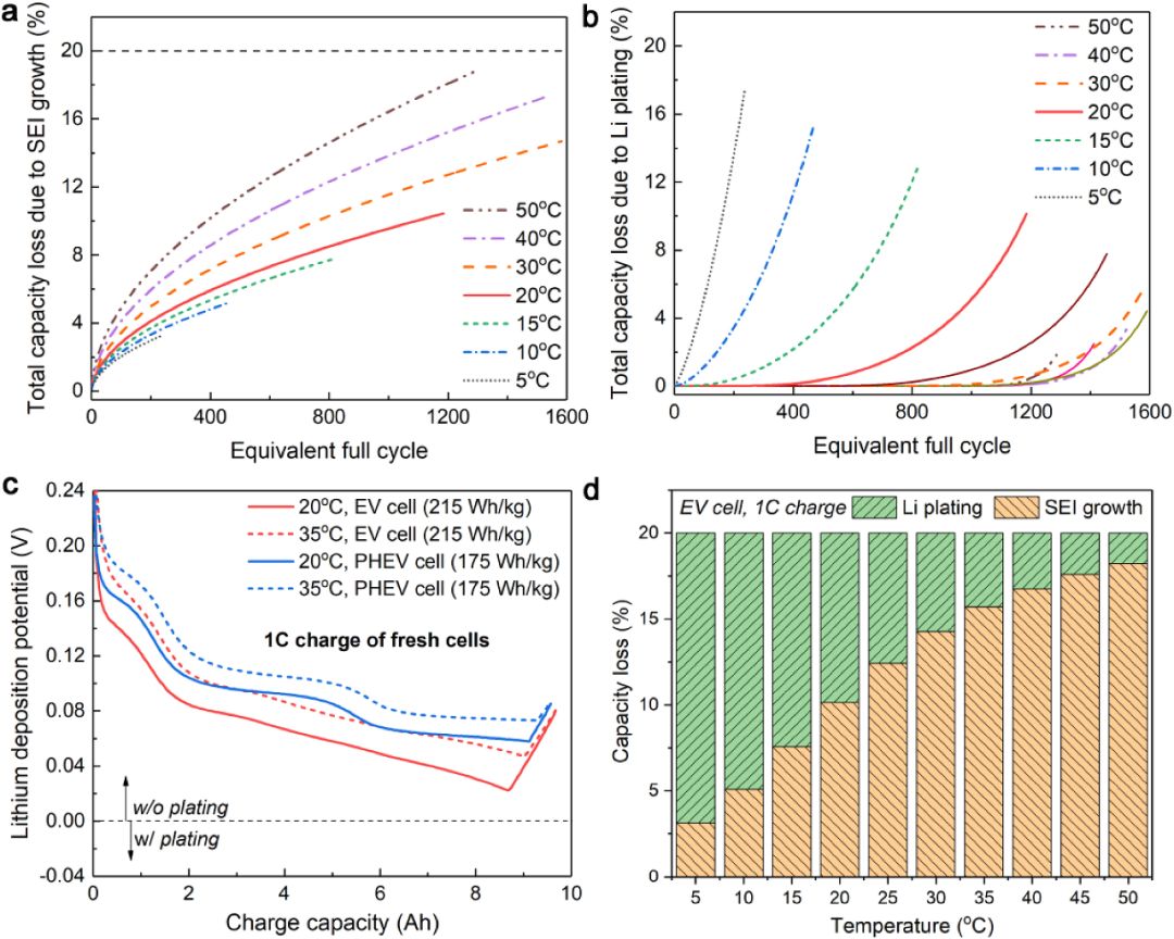 图7 随着能量密度的增加,析锂更严重。EV电池在不同温度下1C充电时循环过程中(a)SEI生长和(b)析锂引起的容量损失的演变。(c)在20℃和35℃下EV电池和PHEV电池的1C充电过程中的锂沉积电位的比较。(d)1C充电寿命结束时EV电池总容量损失的分解。