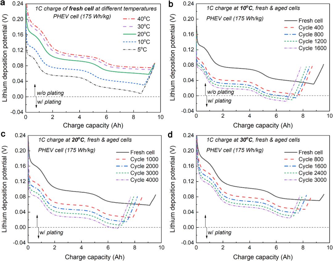图3 随着温度的降低,析锂出现较早。 (a)新鲜PHEV电池在不同温度下1C充电过程中锂沉积电位(LDP)的演变。在不同温度不同循环次数后的PHEV电池锂沉积电位(LDP)的演变:(b)10°C,( c)20℃和(d)30℃。